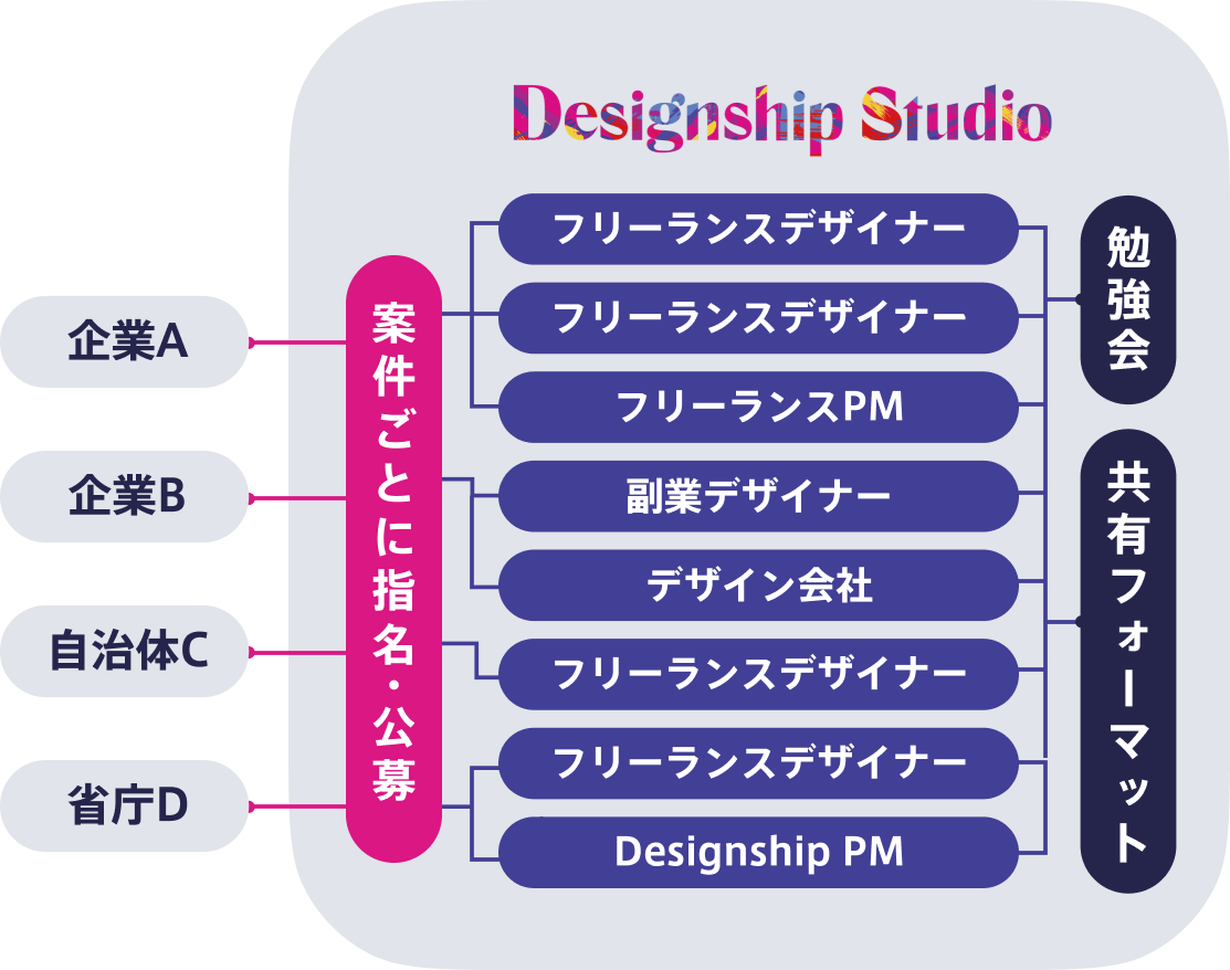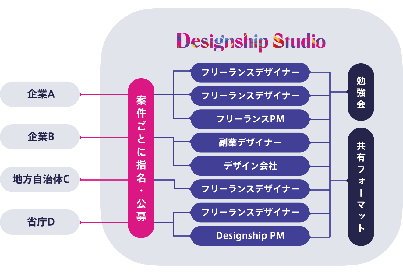 日本最大級のデザインカンファレンスを主催するDesignshipが、全国のフリーランスデザイナー・PMが集うコミュニティを運営し、依頼したい企業・行政とつなげます。
