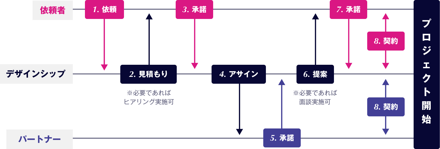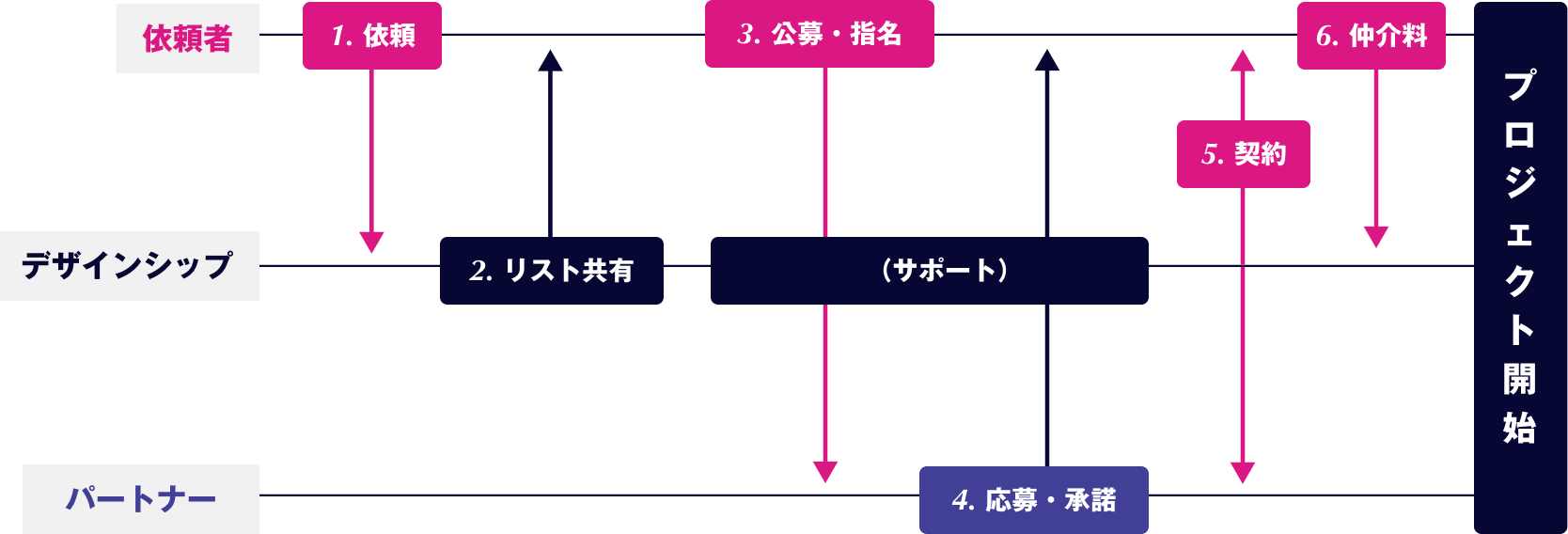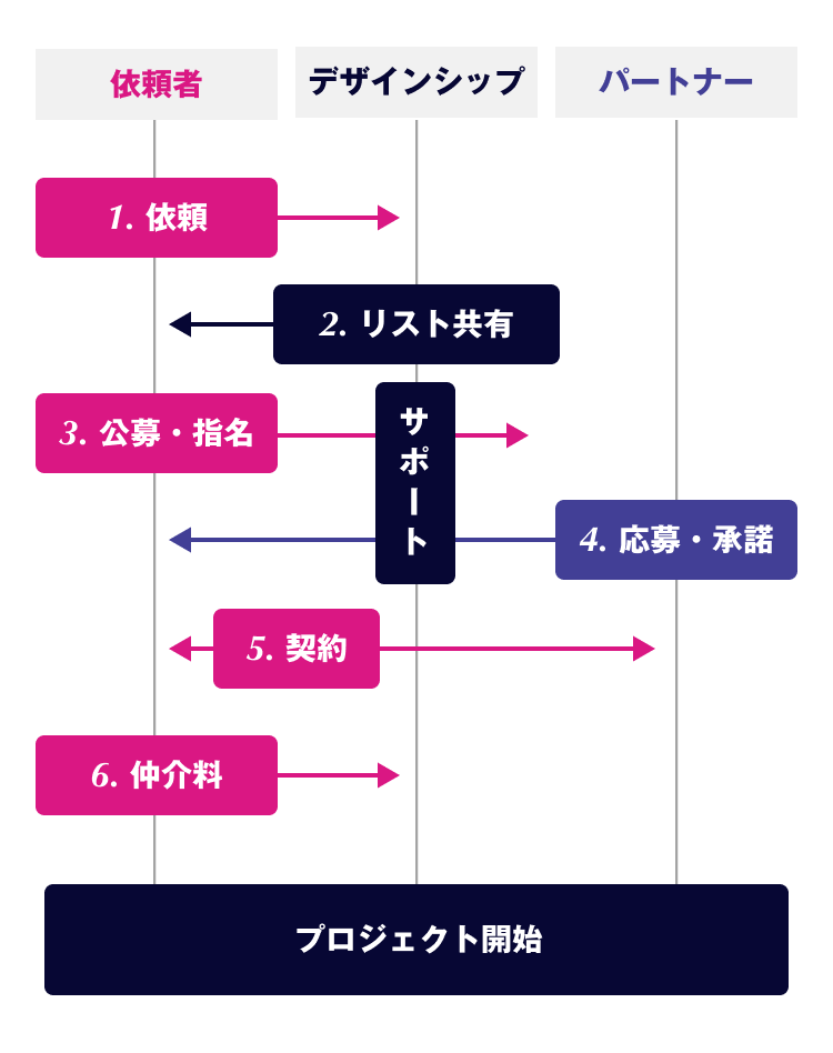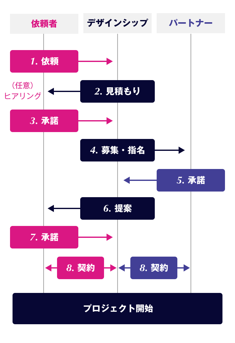 Designshipとの契約になりますので、仲介料は発生しません。私達がまとめて見積もりとアサインをおこないます。必要に応じてPMやDesignshipのボードメンバーがアサインされます。
